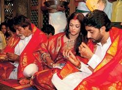 Молодожены Абхишек Баччан и Айшвария Рай вкушают «прасад» (культовую пищу) вместе с отцом и свекром Амитабхом Баччаном