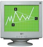 Треугольник (восходящий и нисходящий). Нижняя сторона (AC) треугольника близка к горизонтальной, левая (АB) имеет восходящий наклон. Амплитуда колебаний внутри треугольника уменьшается. Считается, что по окончании формирования восходящего треугольника в большинстве случаев курс валюты пробивает верхнюю его границу (BC), поэтому сразу по достижении кривой верхней границы треугольника обычно устанавливают заявки на покупку