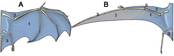 Сравнение крыла летучей мыши (А) и птерозавра (Б)