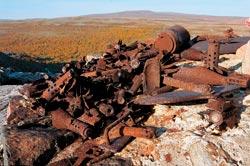 Мы находимся теперь «в тылу» российской территории, но на перекрестке двух бывших границ: гражданской советско-финской 1940-го (она шла по оси Среднего и Рыбачьего) и советско-немецкого фронта 1941—1944 годов. Это хребет Муста-Тунтури, весь он просматривается с узкого скалистого плато с диагональными трещинами, продуваемый ветром и подчеркнутый лучами низкого солнца. Со всех сторон пока хватает глаз – сопки, скалы, море. Под ногами что-то хрустит, опустив голову, с удивлением видишь: гильзы. Чуть поодаль валяется ржавый «хвост» от мины, похожий на шестеренку. Связки колючей проволоки. Осколки. Поразительно – будто не прошло 65 лет с тех пор, как все это сеяло смерть вокруг. Так медленно ползет время тут, в Заполярье.
