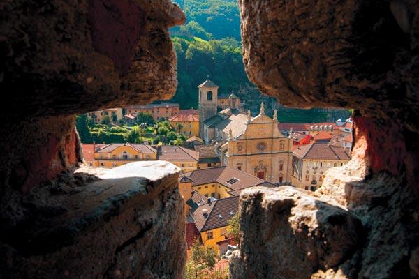 Вид сквозь бойницу замка Кастельгранде на Беллинцону, последний большой город на пути русской армии в Швейцарском походе