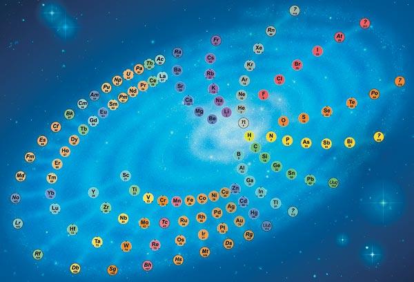 Спиральное представление таблицы Менделеева, предложенное профессором химии и дизайнером Филиппом Стюартом (chemicalgalaxy.co.uk), имеет ряд пре имуществ перед традиционным. Подложка в виде галактики напоминает о космическом происхождении необходимых для жизни элементов
