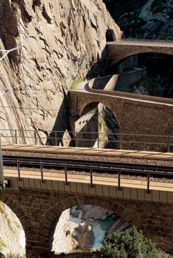 Сегодня от Беллинцоны до подножия Сен-Готарда полчаса езды по скоростной автостраде. В 1799-м русские два дня месили тут грязь, двигаясь под проливным дождем. Автострада уходит в пробитый в горе Сен-Готардский туннель. Не доезжая до него, нужно свернуть к перевалу около городка Айроло. Если хотите побыстрее попасть наверх, поезжайте по новой дороге А2, построенной над ущельем на высоченных опорах. Притормозите на смотровой площадке у самого перевала – отсюда, с высоты 2100 метров, открывается фантастический вид на ущелье Валь-Тремола, по которому вьется серпантин старой Сен-Готардской дороги. Хотя в XIX веке ее расширили, она и сейчас проходит рядом со старинной тропой через перевал, по которой и шел Суворов.