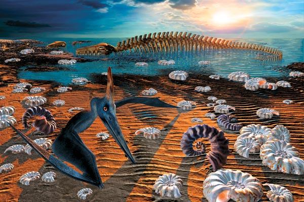 Кратер и особые горные породы, найденные в районе полуострова Юкатан, на территории современной Мексики, свидетельствуют о том, что там упал астероид. Его падение вызвало катастрофические последствия: взрывная волна выжгла почти все живое в округе, а чудовищное цунами опустошило берега. Волна вынесла на побережье морских обитателей, таких как спрятанные в спиральную раковину моллюски-аммониты и морские ящеры – мозазавры. Их останки оказались за километры от воды и послужили пищей для редких выживших обитателей суши. При ударе о землю астероид испарился и выбил из кратера смесь пыли, пепла, едкого пара, которая, поднявшись в атмосферу, отравила ее и затмила Солнце. Резкое похолодание и кислотные дожди длились, вероятно, несколько лет. Это событие сопровождалось вымиранием 35% видов морских обитателей, а также всех крупных рептилий: морских ящеров, динозавров и птерозавров. Рис. ОЛЬГА ОРЕХОВА-СОКОЛОВА