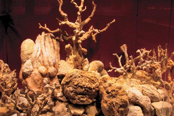 Морское дно мелового периода до того, как оно опустело 65 миллионов лет назад. Слева – раковины моллюсковрудистов, «динозавров морей», названных так за крупные размеры и одновременное вымирание. Диорама создана из подлинных палеонтологических объектов, ее автор – Сантьяго Лафарга. Фото: АНДРЕЙ ЖУРАВЛЕВ