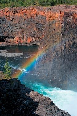 В обрыве плато Путорана четко видна толща базальтов, излившихся 251 миллион лет назад за кратчайший срок – тысячи лет. Покров древней лавы в этих местах достигает толщины 1,8 километра. Фото: СЕРГЕЙ ФОМИН/RUSSIAN LOOK