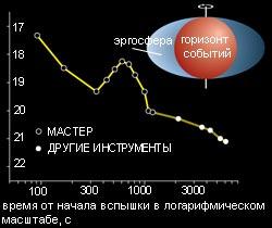 Известно, что при коллапсе массивной звезды образуется черная дыра – сферическая область пространства-времени, окруженная горизонтом событий, из-под которого ничто не может выйти наружу. Но если исходная звезда вращалась, возникшая черная дыра устроена сложнее: горизонт у нее поменьше, зато его, подобно белку вокруг яичного желтка, окружает особая область – эргосфера, в которой само пространство вращается и увлекает за собой любые объекты. Остановиться здесь нельзя никакими силами, но вот выбраться при некотором везении возможно. Если скорость вращения коллапсирующей звезды очень велика, вещество не может сразу уйти под горизонт и «зависает» в эргосфере, пока не потеряет из-за газодинамического трения лишнюю энергию. При этом оно разогревается до чудовищной температуры и интенсивно излучает. Именно этим астрофизики ГАИШ объясняют редкие случаи затянувшегося оптического свечения гамма-всплесков. В январе 2007 года было зарегистрировано еще одно такое событие, где коллапсирущее вещество получило «отсрочку приговора» на целых пять часов. Излучение в это время приходит к нам из области, которая по размерам даже меньше обычного гравитационного радиуса (горизонт у вращающейся черной дыры меньше, чем у обычной). Из-за огромного гравитационного поля время здесь замедляется в 10– 15 раз. Нигде больше во Вселенной мы не наблюдаем процессов, происходящих в условиях столь сильно выраженных эффектов общей теории относительности.