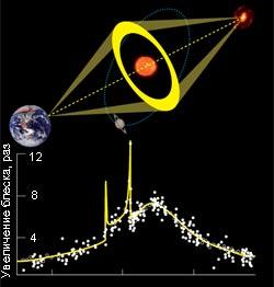 Первая экзопланета была открыта методом микролинзирования 21 июля 2003 года в эксперименте OGLE. Плавный «горб» (см.график) на кривой блеска далекой звезды в ядре Галактики вызван звездой-линзой, а короткие сильные всплески на нем – планетой примерно в 1,5 раза массивнее Юпитера