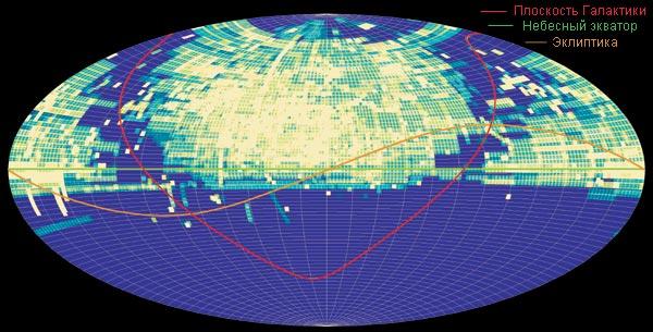 Плотность покрытия неба снимками телескопа МАСТЕР за 3 года. Неохваченная (темная) полоса – Млечный Путь, где снимки трудно анализировать