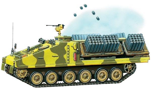 Британский самоходный минный заградитель FV125 «Шильдер» за работой. Шесть поворотных установок по 12 направляющих для минных кассет позволяют устанавливать минные поля различной конфигурации