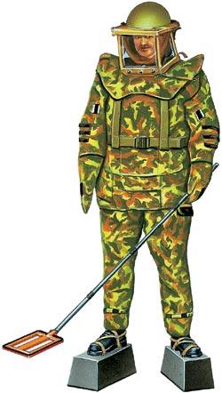 Защитный комплект сапера «Дублон», Россия. Обеспечивает защиту головы и туловища (круговую), а также конечностей (спереди) от действия мин типа ПМН-2 (с дистанции 1 м), при дополнительном бронировании – от осколков МОН-50 – с 10—15 м, МОН-90 – с 15—25 м, а также от пуль автоматов АКМ и АК-74