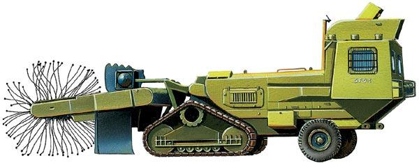 А вот британцы, например, издавна уделяют большое внимание бойковым тралам. На поднятый над землей горизонтальный барабан крепятся цепи с грузиками, барабан раскручивается, цепи с силой бьют по грунту и либо заставляют мины сработать, либо отбрасывают их. Траление довольно надежно, но работа трала требует отбора мощности у двигателя машины-тральщика (впрочем, установка любого трала требует от тральщика запаса мощности) и сопровождается густой завесой пыли и комьев земли, которая уже сама по себе задерживает движение.