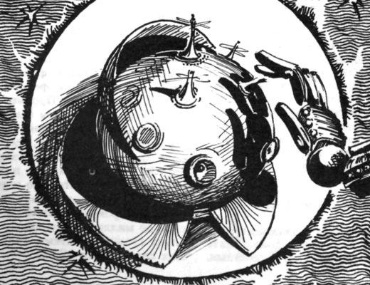 Я облетел луноподобного Масса по пеленгу и увидел невероятное: в его корпусе была огромная вмятина! Какая же небесная сила здесь приложилась?! По утверждениям создателей, с этими роботами никто не в состоянии справиться. Окажись он и в центре взрыва сверхновой, их просто отшвырнуло бы на энное количество парсеков. Теперь я понял причину удрученности огромного Масса.