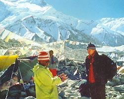 Чо-Ойю встретила их солнышком и голубым небом. Еще более добросердечно встретили их западные альпинисты – корейцы, французы, испанцы – в изобилии толкающиеся в базовом лагере и соблюдающие «народные гималайские традиции»: раз приехали русские, надо ждать и не высовываться. Они сами все сделают. В лучшем случае можно предложить им сотрудничество, например, принести веревки для обработки маршрута. На этот раз на горе работал Рассел, известный гид из Новой Зеландии. Отсиживаться за чужими спинами он не привык, и тут они действительно «отпахали» вместе, облегчив жизнь друг другу. В группе Рассела шла и Юнко Табей, легендарная японка, первая женщина мира, покорившая Эверест.