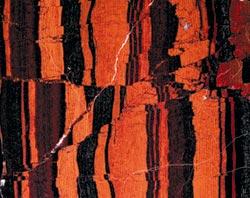 На полированной поверхности образца железистого кварцита ритмически чередуются мономинеральные прослойки кроваво-красного гематита (ярко окрашенной разновидности кремния), яшмы и полупрозрачного желтовато-коричневого тигрового глаза. В этом образце клинышек породы соскользнул по двум трещинам, утратив взаимосвязи с продолжениями своих прослоек. Около 3 миллиардов лет назад железистые кварциты накапливались на дне мелководных морей, где под воздействием примитивных водорослей растворенное двухвалентное железо, окисляясь, превращалось в нерастворимый осадок. Последовавшее глубокое захоронение и тектонические движения привели к перекристаллизации и деформациям минеральной массы. При содержании железа свыше 25% железистые кварциты являются рудой. Десятки месторождений данного типа составляют основу сырьевой базы черной металлургии мира.