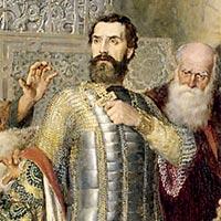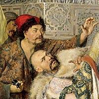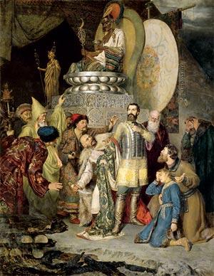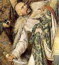 Возможное объяснение этого очевидного противоречия мы находим в Ипатьевской летописи – самом старом источнике, сообщающем о гибели Михаила Всеволодовича. Там говорится буквально следующее: «Батыеви же рекшоу: Поклонися отец наших законоу», то есть «поклонись закону наших отцов». Речь в данном случае идет именно о законах, а не о верованиях. Однако в более поздних летописях присутствует другая формулировка: «Поклонись богам наших предков». И, что удивительно, именно так историки XIX века переводили с древнерусского процитированный нами отрывок. Этот вариант перекочевал и в житие Михаила Черниговского, которым пользовался, создавая картину «Князь Михаил Всеволодович перед ставкой Батыя», художник Василий Смирнов (1858–1890).