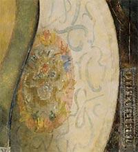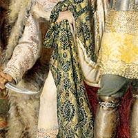 Расшитый золотом плащ.Михаил совлекает с себя этот символ княжеской власти правой рукой. Художник тем самым хочет показать, что его герой готов ради веры отказаться от всех земных благ. Это прямое цитирование средствами живописи фразы, якобы произнесенной князем: «Примите же славу этого мира, я же ее не хочу».