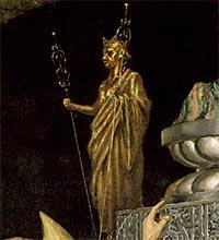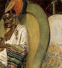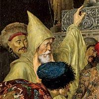 Монгольский «священник»,указующий князю перстом на «идола» как на путь спасения. Персонаж удивительный, поскольку никаких священнослужителей в то время у монголов не было. Его облачение – это нечто среднее между рясой христианского схимника и тогой тибетского монаха, а зеленый цвет, видимо, как-то связан с исламом, который в Орде был принят на 70 лет позже описываемых событий.