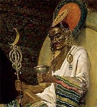 Большой монгольский идол.Его фигура (коричневый цвет, чрезвычайная сухость сложения) вызывает прямые ассоциации с индуистскими йогинами. В одной руке у него чаша, в какую буддийские монахи собирают подаяние, в другой – буддийский же посох, и это при том, что буддизм к йоге не имеет никакого отношения. Ко всему прочему посох увенчан исламским полумесяцем.