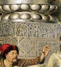 Постамент идола.Художник украсил его арабской вязью, видимо, потому, что иноверие у него ассоциировалось прежде всего с исламом. Хотя ни арабское письмо, ни ислам монголы в то время не практиковали.