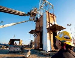 Последние часы подготовки купола, который планировалось установить над скважиной, чтобы остановить утечку. Попытка не удалась. Фото: WWW.BP.COM