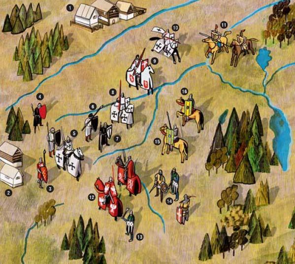 Основными силами ордена – 15 отборными знаменами (аналог хоругвей у союзников) командовал сам магистр, ставка которого находилась на невысоком холме, за которым стоял обоз. Гости ордена стояли напротив литовцев и татар, то есть язычников, поднять меч против которых было делом богоугодным.