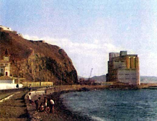 Аэропорт расположен в тринадцати километрах от города. Ровная прямая дорога бежит по пустынной местности, и вдруг с подъема открывается бухта Порту-Гранди. Пирс, стоящие в гавани суда, элеватор, аккуратные кварталы невысоких серо-белых домиков – это город-порт Минделу, который зеленомысцы называют «сердцем» страны.