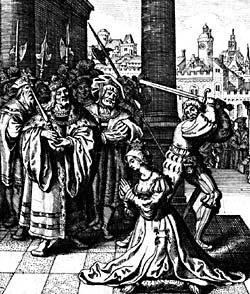 Эшафот был покрыт черной материей, а меч спрятан между досками. Зрители – около тысячи, только лондонцы (никаких иностранцев) – под предводительством мэра города пришли засвидетельствовать первую в истории Англии казнь королевы. Она, в платье из серого дамаска, отороченном мехом, поднявшись на первую ступеньку эшафота, обратилась с речью к толпе: «Я умру согласно закону. Я здесь не для того, чтобы обвинять кого-то или говорить о том, в чем меня обвиняют. Но я молю Бога, чтобы он спас короля и его правление, ибо не было еще более доброго принца, а для меня он всегда был самым нежным и достойным лордом и сувереном. Я прощаюсь с миром и от всего сердца прошу вас молиться за меня».