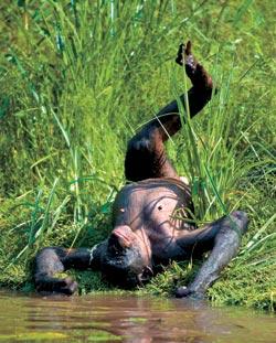 И тем не менее среди современных человекообразных обезьян нет ни одного хотя бы относительно благополучного вида, а судьба бонобо выглядит особо тревожной. Сегодня известна одна-единственная их популяция в дикой природе, живущая на небольшой территории в верховьях Конго и по берегам одного из главных притоков этой реки – Луалабы. Некоторое время назад там обитало около 10 тысяч бонобо. Сколько их сейчас, никто не знает: с первой половины 90-х эти места стали театром военных действий. Сначала туда, спасаясь от геноцида, бежали жители соседней Руанды, затем вспыхнула гражданская война в самом Заире (ныне – Демократическая Республика Конго). В условиях постоянной смены властей и фактического отсутствия источников финансирования национальные парки прекратили свою работу, и дикие животные, в том числе и человекообразные обезьяны, стали каждодневной добычей воюющих сторон, а также дезертиров, бандитов, профессиональных браконьеров и просто местных жителей, которым нужно было чем-то кормить свои огромные семьи. Копченое мясо бонобо до сих пор открыто продается на местных рынках.