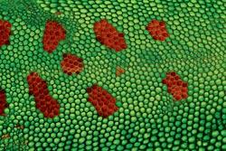 Среди ящериц существует немало великолепно окрашенных видов. Но гекконы – ящерицы, умеющие бегать по гладким вертикальным поверхностям, – в большинстве своем ведут ночной или сумеречный образ жизни, поэтому их покровительственная окраска коричневых и серых тонов. В отличие от своих собратьев мадагаскарский дневной геккон в полном соответствии со своим названием обитает в лесах на севере Мадагаскара и на соседнем островке Нуси-Бе и ведет дневной образ жизни, охотясь на насекомых и пауков, разнообразя свою диету фруктами, нектаром и пыльцой цветов. Роговые чешуйки, защищающие тело этой небольшой ящерки от высыхания и повреждений, окрашены в зеленый цвет, на фоне которого разбросаны красные пятна. Кожа гекконов очень непрочная, ее куски легко отрываются и остаются в зубах хищников, что дает ящерице время на отступление.