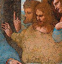 Так, иконографический тип апостола Иоанна всегда отличала известная женственность, и существует масса картин, где он изображен таким, как у Леонардо. Буквы V и М (черным) вполне можно расставить по всей картине, как, впрочем, и найти другие «шифры», например букву W (черным) – в христианской иконографии символ гермафродита. Нет сомнений и в том, что рука с ножом принадлежит Петру: этот нож присутствует в евангельских сюжетах. А поднятый палец – универсальный жест призвания во свидетели небесных сил.