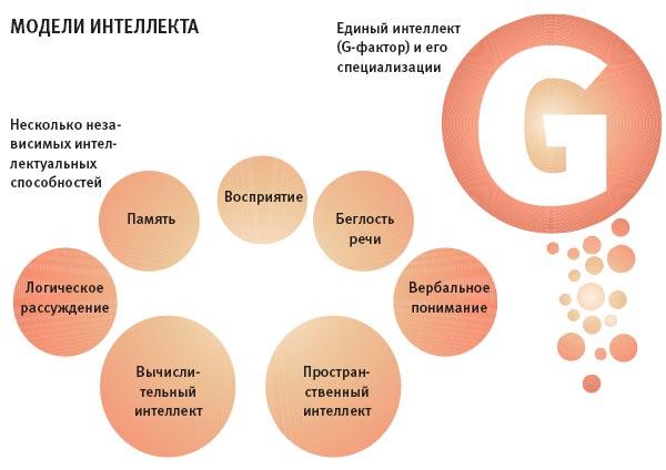 Подход Тёрстоуна был развит другими исследователями. Так, Говард Гарднер в 1983 году выделил восемь независимых типов интеллекта человека: музыкальный, зрительно-пространственный, натуралистический (умение наблюдать природные явления), вербально-лингвистический, логико-математический, телесно-кинестетический, межличностный и внутриличностный (богатство духовной жизни). В работах Джона Кэрролла (1976) выделялось 24 фактора интеллекта, а в исследовании Эдвина Флейшмана (1984) – 52. Но еще раньше, в 1967 году, рекордное количество независимых интеллектуальных способностей (целых 120 разновидностей!) постулировал Джой Гилфорд в своей структурной модели интеллекта. Становилось непонятно, что же отражает все это многообразие: реальную природу интеллекта или особенности методик, применяемых для его исследования?