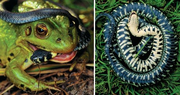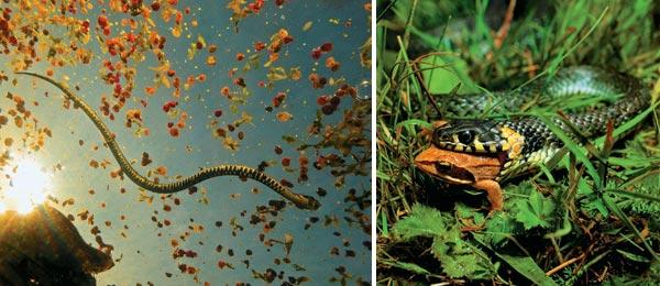 2. Настигнуть и схватить лягушку для ужа обычно не представляет труда. Гораздо сложнее ему дается заглатывание пойманной жертвы
