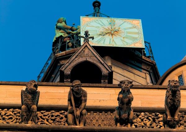 Фасад готической церкви Нотр-Дам XIII века с самого начала украшали химеры, символизирующие изгнанные из храма пороки. После того как одна из них свалилась вниз, химер убрали и вернули на прежнее место лишь в конце XIX века. Часы Жакмар с железными механическими фигурами – одни из самых старых во Франции