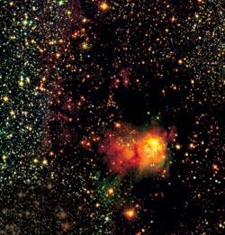 С помощью этого инструмента испанский астроном Фернандо Комерон (Fernando Comeron) получил изображение крупного комплекса звездообразования RCW 108. Оно составлено из 600 отдельных кадров и покрывает на небе площадь, равную половине лунного диска. В научном отношении эта картина интересна тем, что подтверждает теоретическую модель «вылупления» молодых звезд из облака – так называемую «модель шампанского». Темное облако, силуэт которого ясно виден на фоне Млечного Пути , играет здесь роль непроницаемой бутылки, внутри которой новорожденные звезды разогревают окружающий газ и поднимают его давление. В конце концов, облако не выдерживает, самая тонкая его стенка («пробка») прорывается, и струя горячего газа выстреливает в окружающее пространство. Именно этот момент мы и наблюдаем на фотографии. Яркая туманность в центре облака – это горячий газ, который вырвался со скоростью около 10 км/с и устремился в направлении Солнца. (Можно не беспокоиться – Солнечной системы он никогда не достигнет.)