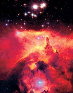 Звездный ветер от молодого скопления Pismis 24 (вверху) сдувает газовые облака туманности NGC 6357. В вершинах характерных столбов находятся плотные протозвезды, способные устоять против звездного ветра