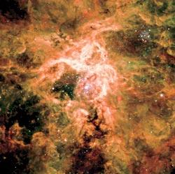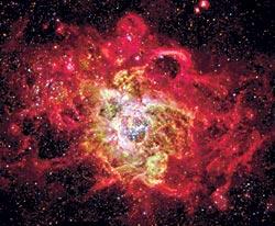 Туманность Тарантул, расположенная в соседней галактике Большое Магелланово Облако, удалена от нас на 170 тысяч световых лет, но сияет так ярко, что различима даже невооруженным глазом. Ее поперечник составляет почти 1000 световых лет. Более крупных очагов звездообразования нет ни в нашей, ни в ближайших галактиках. В центре снимка, полученного 8-метровым телескопом VLT Европейской Южной обсерватории в Чили, расположено скопление молодых, массивных и очень горячих звезд Рэдклиф 136 (R 136), чье мощное излучение и сильные звездные ветры как раз и заставляют туманность сиять. Возраст этого скопления всего 2—3 миллиона лет, поэтому его наиболее массивные звезды еще живы. А таких звезд там более 200, причем массы некоторых превышают 50 масс Солнца; такие тяжеловесы формируются крайне редко. Правее и выше центра на этом фото видно другое скопление ярких массивных звезд – Ходж 301. Его возраст около 20 миллионов лет. Поэтому наиболее массивные звезды в нем уже закончили свой жизненный путь и взорвались как сверхновые, выбросив с огромной скоростью вещество и создав вокруг скопления сеть запутанных волокон. Вскоре там ожидаются новые взрывы, так как в скоплении Ходж 301 наблюдаются три красных сверхгиганта, которые в течение ближайших трех миллионов лет тоже закончат свою жизнь гигантским фейерверком. В то время как одни звезды умирают в этом «космическом пауке», другие там только зарождаются. Множество темных облаков, легко различимых на светлом фоне, указывает нам, где происходят охлаждение и сжатие газа, готового дать жизнь следующим поколениям звезд. Фактически Тарантул – это гигантский инкубатор, где рождаются звезды всевозможных масс, не только тяжеловесы, но и такие, как Солнце (хотя нам издалека видны только гиганты). В некоторых местах этого облака происходит удивительный процесс повторного, стимулированного звездообразования: мощное излучение и взрывы массивных звезд порождают ударные волны, которые сжимают окружающий газ, создавая тем самым условия для формирования звезд следующего поколения.