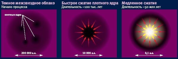 В процессе формирования каждая звезда проходит через два характерных этапа – быстрого и медленного сжатия протозвезды. Быстрое сжатие – это практически свободное падение вещества протозвезды к ее центру. На этом этапе безраздельно царствует гравитация. И хотя при сжатии газ должен был бы нагреваться, его температура почти не меняется: избыток тепла уходит в виде инфракрасного излучения, для которого рыхлая протозвезда совершенно прозрачна. Так проходит около 100 тысяч лет, в ходе которых размер протозвезды сокращается в 100 тысяч раз, а плотность вещества возрастает в миллионы миллиардов раз – от почти полного вакуума до плотности комнатного воздуха.
