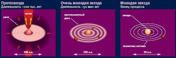 Один из таких механизмов обеспечивает газовое трение: внутренние, быстро вращающиеся области протозвезды трутся о внешние, передавая им энергию своего движения. Сами они при этом тормозятся, получая возможность сжиматься дальше и стать звездой, а внешние области, наоборот, раскручиваются и остаются вращаться в виде тонкого диска, из которого позже образуются планеты. Жизнь этого протопланетного диска сама по себе очень интересна и слабо изучена. Например, на некотором этапе эволюции диска вдоль его оси вращения в обе стороны могут «выстреливаться» тонкие струи газа.