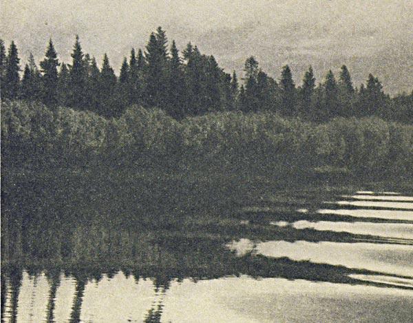 ...Вдруг Хет, бежавший на шаг впереди меня, ткнулся носом в землю и коротко пролаял. По кочкам, густо поросшим клюквой, протянулась чуть заметная строчка лисьего следа. С этого и пошло. Через несколько шагов ясно прочел я тяжелую и быструю поступь лося, а потом увидел, как медведь косолапил по болоту.
