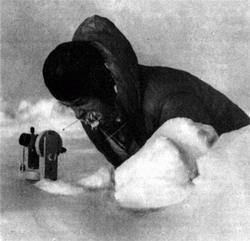 Ступаем на сплоченное и схваченное морозом месиво мелкобитого льда, снежной шуги, «сала». Впереди, насколько хватает глаз, все такие же коварные, предательски-ненадежные поля, разделенные черными трещинами или грядами торосов. С каждым шагом мы все дальше и дальше углубляемся в зону молодого льда. Связь с лагерем через каждые 30 минут. Ребята волнуются, надеются услышать обнадеживающие новости, а их нет. Цвет молодых ледяных полей становится все темнее, а ото значит, что толщина их уменьшается. Вынуждены возвращаться.