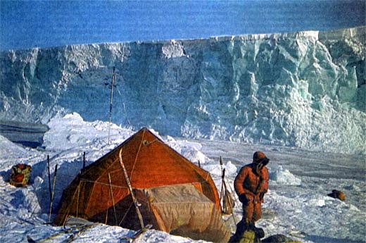 Только через несколько часов, выбрав льдину покрупнее, принимаемся за устройство лагеря. В порывах ветер уже достигает 25 метров в секунду. Палатку рвет из рук, кажется, никакая сила не способна сейчас противостоять природе. Однако проходит час-полтора, и палатка надежно, словно огромными шурупами, привернута ледобурами к поверхности льдины. С наветренной стороны мы устроили стенку из вертикально установленных санок, лыж, снежных кирпичей.