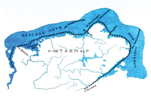 До Диксона оставалось 250 километров. К утру вышел на восточный берег Пясинского залива. Впереди шхеры Минина, сложный для мореплавания участок. Даже паровая яхта Э.В. Толля «Заря» в 1900 году с большим трудом выбралась из этого района. «Все еще в шхерах Минина, которые доставляют нам немало огорчений», – писал в дневнике Толль 23 августа.
