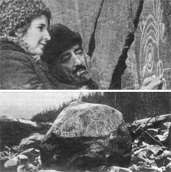 При желании можно было бы проложить по Ангаре интереснейший маршрут в глубь веков – так богаты ее берега памятниками культуры. И один из них, уникальный,– Дубынинская писаница, открытая Октябрем Леоновым. Его и Галину Штеле, ныне директора Ангарской деревни, вы видите на снимке. Фото из архива О.Леонова и В.Леонтьева.