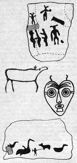 И они нашлись, более ста рисунков разных эпох! Целая картинная галерея! Это было настолько неожиданным и невероятным, что в Братск срочно прилетел академик А.П.Окладников и в мороз лазил по скалам Долгого порога. Там, на Дубынинской писанице, увидел я впервые загадочные, ни на что не похожие изображения человеческих лиц сердцевидной формы с огромными глазами, обведенными концентрическими окружностями. Они сурово и удивленно смотрели со скал на грозно шумящий порог... Что это за изображения? Откуда они пришли в мир охотников на лосей, чьи изображения главенствовали на Дубынинской писанице?