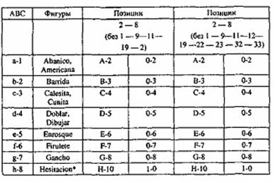 «Веер», «американка», «мусор», «кабриолет», «колыбелька», «удваивать, сгибать», «чертить», «ввинчивание», «побрякушка», «крюк», «сомнения» (фигуры танго) (исп.).