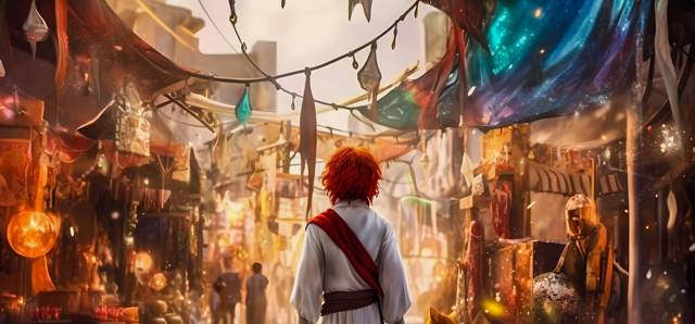Тем временем я вылез из колодца. И первое, что увидел – это большой рынок, который напоминал некое фэнтезийное средневековье вперемешку с арабскими мотивами в виде узких каменных улочек и кучи разноцветных шатров. Удивительные стоны, рокот, мычания, жужжания, пения, стрекотания, кряканья и даже рычания с воем дополняли и усиливали картину. А от богатого запаха пряностей нос пытался накормить мой голодный желудок. И всему этому способствовал лёгкий прохладный ветерок, который дразнил мои вкусовые рецепторы, обдувая мой детский язычок.