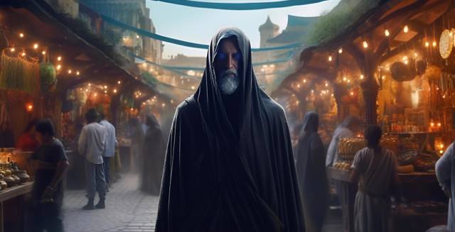 Стоило мне только сделать первый шаг в направлении лавок и разноцветных шатров, как на одной из узких улочек показался тот самый двухметровый незнакомец в чёрной мантии. Его синие светящиеся глаза скрылись между разноцветными шёлковыми халатами, которые демонстрировал клиенту антропоморфный слон.