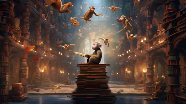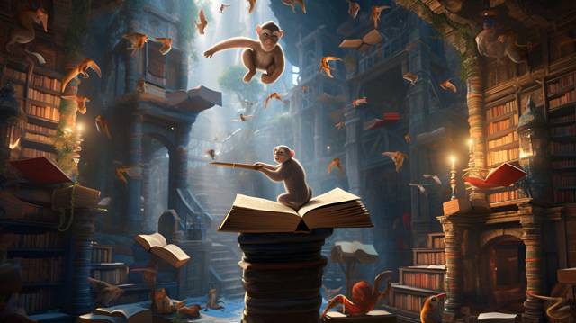 Как и в прошлом читальном зале, здесь посередине, на огромной стопке книг восседал очередной король, но на этот раз король настоящих обезьян, без всякой гибридности. Вместо крыльев, как у хомяков-птиц, обезьяны использовали летающие книги.