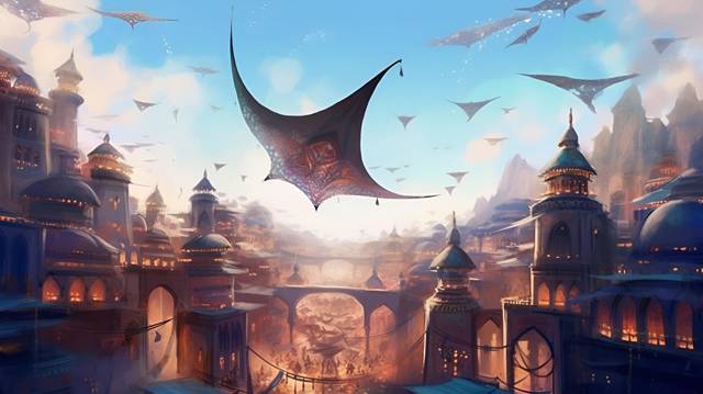 Вообще, часть Каладеша, похожая на Рахират, выглядела так, как Рахират во время очередного фестиваля – то есть нарядный такой город с кучей магии, цветных шатров и летающих воздушных шаров, ковров, украшающих «потолок» улиц. Сами же улицы тоже были пошире, что не могло не радовать.